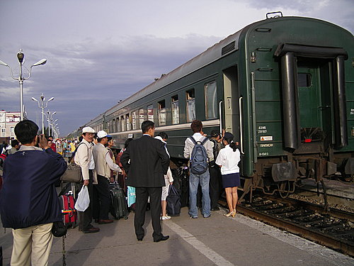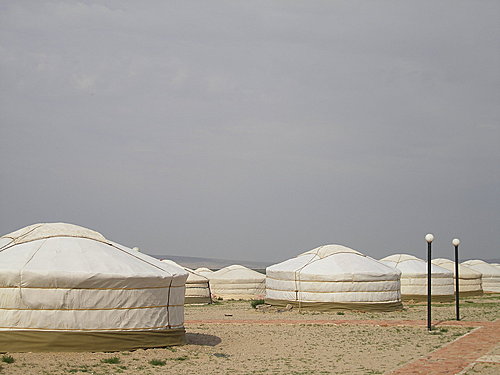 (2007.07.14)火車在凌晨1點多到達東戈壁省賽音山達車站,分乘數輛吉普車,黑暗中幾個司機像在賽車似的,而且沒有固定路線的往前衝,走的也絕不是我們認知的「馬路」,黃土飛揚,同車老先生的筋骨那堪折磨,旁坐的團員自顧不暇,搖晃顛頗中還得扶著他,免得散了;進渡假村後雖然吃飽風沙,但主人已經準備了濃濃的熱奶茶、香噴噴的炸捲餅,為了儲存體力應付明天的活,(我們不是來玩的嗎?)努力吃吧,分配好蒙古包後,個個已累得快癱了,管他什麼包、什麼床,行李也沒了力氣整理,趕緊鑽進被窩補眠。