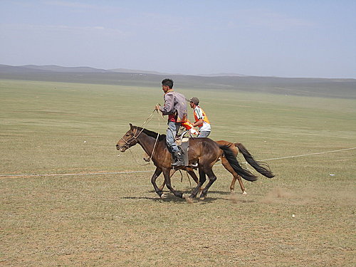 蒙古國一年一度最盛大及最熱鬧的節慶。即乘車到市郊草原上參觀賽馬,一路上人車蜂擁而至,還有不少老老少少騎馬,由草原丘陵各處向比賽場地而去,車陣更是蜿蜒數里,待乘坐的車轉進草原上後,因今年雨量不佳,本來就稀少而短小的草,禁不住蹂躪,隨著車子前行,撲天蓋地的黃土滾滾,下車行至參觀區才似乎好一點,為了能更近的感受和看到賽馬,走向終點卻是萬頭鑽動,雙腳不自覺的跟著人群飄動,更是甭想取個好鏡頭;當第